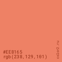 Цвет #EE8165 в цветовой модели RGB обозначается тремя октетами (238, 129, 101) в десятичном формате и #EE8165 в шестнадцатиричном (hex) формате, которые являются интенсивностью красного 238 (hex EE), интенсивность зелёного 129 (hex 81) и интенсивность синего 101 (hex 65).