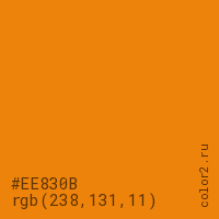 Цвет RGB(238, 131, 11) в процентом отношении количества цвета состоит из 93.3% красного (red), 51.4% зелёного (green) и 4.3% синего (blue).