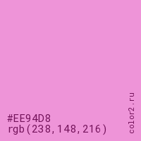 Цвет #EE94D8 в цветовой модели RGB обозначается тремя октетами (238, 148, 216) в десятичном формате и #EE94D8 в шестнадцатиричном (hex) формате, которые являются интенсивностью красного 238 (hex EE), интенсивность зелёного 148 (hex 94) и интенсивность синего 216 (hex D8).