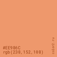 Цвет #EE986C в цветовой модели RGB обозначается тремя октетами (238, 152, 108) в десятичном формате и #EE986C в шестнадцатиричном (hex) формате, которые являются интенсивностью красного 238 (hex EE), интенсивность зелёного 152 (hex 98) и интенсивность синего 108 (hex 6C).
