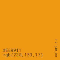Цвет #EE9911 в цветовой модели RGB обозначается тремя октетами (238, 153, 17) в десятичном формате и #EE9911 в шестнадцатиричном (hex) формате, которые являются интенсивностью красного 238 (hex EE), интенсивность зелёного 153 (hex 99) и интенсивность синего 17 (hex 11).