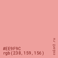 Цвет #EE9F9C в цветовой модели RGB обозначается тремя октетами (238, 159, 156) в десятичном формате и #EE9F9C в шестнадцатиричном (hex) формате, которые являются интенсивностью красного 238 (hex EE), интенсивность зелёного 159 (hex 9F) и интенсивность синего 156 (hex 9C).