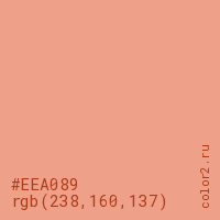 Цвет #EEA089 в цветовой модели RGB обозначается тремя октетами (238, 160, 137) в десятичном формате и #EEA089 в шестнадцатиричном (hex) формате, которые являются интенсивностью красного 238 (hex EE), интенсивность зелёного 160 (hex A0) и интенсивность синего 137 (hex 89).