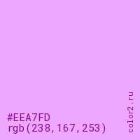 Цвет #EEA7FD в цветовой модели RGB обозначается тремя октетами (238, 167, 253) в десятичном формате и #EEA7FD в шестнадцатиричном (hex) формате, которые являются интенсивностью красного 238 (hex EE), интенсивность зелёного 167 (hex A7) и интенсивность синего 253 (hex FD).