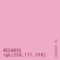 Цвет #EEABC6 в цветовой модели RGB обозначается тремя октетами (238, 171, 198) в десятичном формате и #EEABC6 в шестнадцатиричном (hex) формате, которые являются интенсивностью красного 238 (hex EE), интенсивность зелёного 171 (hex AB) и интенсивность синего 198 (hex C6).
