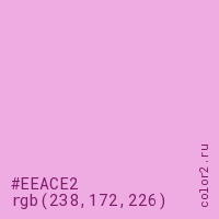 Цвет #EEACE2 в цветовой модели RGB обозначается тремя октетами (238, 172, 226) в десятичном формате и #EEACE2 в шестнадцатиричном (hex) формате, которые являются интенсивностью красного 238 (hex EE), интенсивность зелёного 172 (hex AC) и интенсивность синего 226 (hex E2).