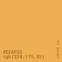 Цвет #EEAF53 в цветовой модели RGB обозначается тремя октетами (238, 175, 83) в десятичном формате и #EEAF53 в шестнадцатиричном (hex) формате, которые являются интенсивностью красного 238 (hex EE), интенсивность зелёного 175 (hex AF) и интенсивность синего 83 (hex 53).
