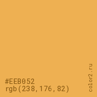 Цвет #EEB052 в цветовой модели RGB обозначается тремя октетами (238, 176, 82) в десятичном формате и #EEB052 в шестнадцатиричном (hex) формате, которые являются интенсивностью красного 238 (hex EE), интенсивность зелёного 176 (hex B0) и интенсивность синего 82 (hex 52).