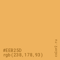 Цвет #EEB25D в цветовой модели RGB обозначается тремя октетами (238, 178, 93) в десятичном формате и #EEB25D в шестнадцатиричном (hex) формате, которые являются интенсивностью красного 238 (hex EE), интенсивность зелёного 178 (hex B2) и интенсивность синего 93 (hex 5D).