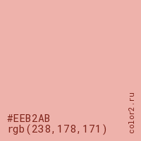 Цвет #EEB2AB в цветовой модели RGB обозначается тремя октетами (238, 178, 171) в десятичном формате и #EEB2AB в шестнадцатиричном (hex) формате, которые являются интенсивностью красного 238 (hex EE), интенсивность зелёного 178 (hex B2) и интенсивность синего 171 (hex AB).
