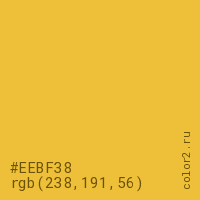 Цвет #EEBF38 в цветовой модели RGB обозначается тремя октетами (238, 191, 56) в десятичном формате и #EEBF38 в шестнадцатиричном (hex) формате, которые являются интенсивностью красного 238 (hex EE), интенсивность зелёного 191 (hex BF) и интенсивность синего 56 (hex 38).