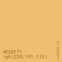 Цвет #EEBF71 в цветовой модели RGB обозначается тремя октетами (238, 191, 113) в десятичном формате и #EEBF71 в шестнадцатиричном (hex) формате, которые являются интенсивностью красного 238 (hex EE), интенсивность зелёного 191 (hex BF) и интенсивность синего 113 (hex 71).