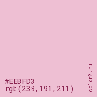 Цвет #EEBFD3 в цветовой модели RGB обозначается тремя октетами (238, 191, 211) в десятичном формате и #EEBFD3 в шестнадцатиричном (hex) формате, которые являются интенсивностью красного 238 (hex EE), интенсивность зелёного 191 (hex BF) и интенсивность синего 211 (hex D3).