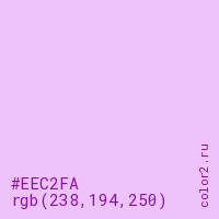 Цвет #EEC2FA в цветовой модели RGB обозначается тремя октетами (238, 194, 250) в десятичном формате и #EEC2FA в шестнадцатиричном (hex) формате, которые являются интенсивностью красного 238 (hex EE), интенсивность зелёного 194 (hex C2) и интенсивность синего 250 (hex FA).