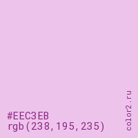Цвет #EEC3EB в цветовой модели RGB обозначается тремя октетами (238, 195, 235) в десятичном формате и #EEC3EB в шестнадцатиричном (hex) формате, которые являются интенсивностью красного 238 (hex EE), интенсивность зелёного 195 (hex C3) и интенсивность синего 235 (hex EB).