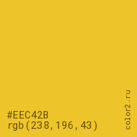 Цвет #EEC42B в цветовой модели RGB обозначается тремя октетами (238, 196, 43) в десятичном формате и #EEC42B в шестнадцатиричном (hex) формате, которые являются интенсивностью красного 238 (hex EE), интенсивность зелёного 196 (hex C4) и интенсивность синего 43 (hex 2B).