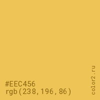 Цвет #EEC456 в цветовой модели RGB обозначается тремя октетами (238, 196, 86) в десятичном формате и #EEC456 в шестнадцатиричном (hex) формате, которые являются интенсивностью красного 238 (hex EE), интенсивность зелёного 196 (hex C4) и интенсивность синего 86 (hex 56).