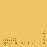 Цвет #EEC566 в цветовой модели RGB обозначается тремя октетами (238, 197, 102) в десятичном формате и #EEC566 в шестнадцатиричном (hex) формате, которые являются интенсивностью красного 238 (hex EE), интенсивность зелёного 197 (hex C5) и интенсивность синего 102 (hex 66).
