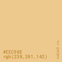 Цвет #EEC98E в цветовой модели RGB обозначается тремя октетами (238, 201, 142) в десятичном формате и #EEC98E в шестнадцатиричном (hex) формате, которые являются интенсивностью красного 238 (hex EE), интенсивность зелёного 201 (hex C9) и интенсивность синего 142 (hex 8E).
