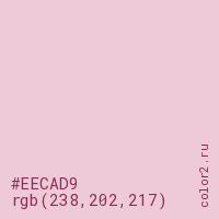 Цвет #EECAD9 в цветовой модели RGB обозначается тремя октетами (238, 202, 217) в десятичном формате и #EECAD9 в шестнадцатиричном (hex) формате, которые являются интенсивностью красного 238 (hex EE), интенсивность зелёного 202 (hex CA) и интенсивность синего 217 (hex D9).
