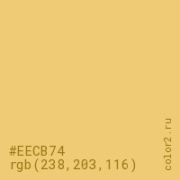Цвет #EECB74 в цветовой модели RGB обозначается тремя октетами (238, 203, 116) в десятичном формате и #EECB74 в шестнадцатиричном (hex) формате, которые являются интенсивностью красного 238 (hex EE), интенсивность зелёного 203 (hex CB) и интенсивность синего 116 (hex 74).