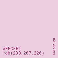 Цвет #EECFE2 в цветовой модели RGB обозначается тремя октетами (238, 207, 226) в десятичном формате и #EECFE2 в шестнадцатиричном (hex) формате, которые являются интенсивностью красного 238 (hex EE), интенсивность зелёного 207 (hex CF) и интенсивность синего 226 (hex E2).