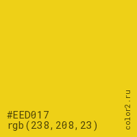 Цвет #EED017 в цветовой модели RGB обозначается тремя октетами (238, 208, 23) в десятичном формате и #EED017 в шестнадцатиричном (hex) формате, которые являются интенсивностью красного 238 (hex EE), интенсивность зелёного 208 (hex D0) и интенсивность синего 23 (hex 17).