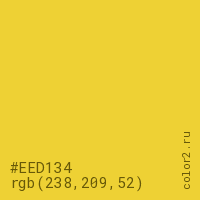 Цвет #EED134 в цветовой модели RGB обозначается тремя октетами (238, 209, 52) в десятичном формате и #EED134 в шестнадцатиричном (hex) формате, которые являются интенсивностью красного 238 (hex EE), интенсивность зелёного 209 (hex D1) и интенсивность синего 52 (hex 34).