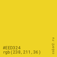 Цвет #EED324 в цветовой модели RGB обозначается тремя октетами (238, 211, 36) в десятичном формате и #EED324 в шестнадцатиричном (hex) формате, которые являются интенсивностью красного 238 (hex EE), интенсивность зелёного 211 (hex D3) и интенсивность синего 36 (hex 24).