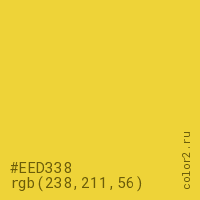 Цвет #EED338 в цветовой модели RGB обозначается тремя октетами (238, 211, 56) в десятичном формате и #EED338 в шестнадцатиричном (hex) формате, которые являются интенсивностью красного 238 (hex EE), интенсивность зелёного 211 (hex D3) и интенсивность синего 56 (hex 38).