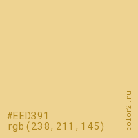 Цвет #EED391 в цветовой модели RGB обозначается тремя октетами (238, 211, 145) в десятичном формате и #EED391 в шестнадцатиричном (hex) формате, которые являются интенсивностью красного 238 (hex EE), интенсивность зелёного 211 (hex D3) и интенсивность синего 145 (hex 91).