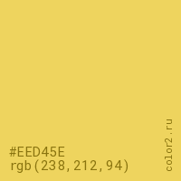 Цвет #EED45E в цветовой модели RGB обозначается тремя октетами (238, 212, 94) в десятичном формате и #EED45E в шестнадцатиричном (hex) формате, которые являются интенсивностью красного 238 (hex EE), интенсивность зелёного 212 (hex D4) и интенсивность синего 94 (hex 5E).