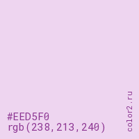 Цвет #EED5F0 в цветовой модели RGB обозначается тремя октетами (238, 213, 240) в десятичном формате и #EED5F0 в шестнадцатиричном (hex) формате, которые являются интенсивностью красного 238 (hex EE), интенсивность зелёного 213 (hex D5) и интенсивность синего 240 (hex F0).