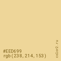 Цвет #EED699 в цветовой модели RGB обозначается тремя октетами (238, 214, 153) в десятичном формате и #EED699 в шестнадцатиричном (hex) формате, которые являются интенсивностью красного 238 (hex EE), интенсивность зелёного 214 (hex D6) и интенсивность синего 153 (hex 99).