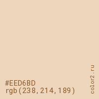 Цвет #EED6BD в цветовой модели RGB обозначается тремя октетами (238, 214, 189) в десятичном формате и #EED6BD в шестнадцатиричном (hex) формате, которые являются интенсивностью красного 238 (hex EE), интенсивность зелёного 214 (hex D6) и интенсивность синего 189 (hex BD).