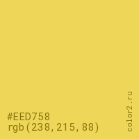 Цвет #EED758 в цветовой модели RGB обозначается тремя октетами (238, 215, 88) в десятичном формате и #EED758 в шестнадцатиричном (hex) формате, которые являются интенсивностью красного 238 (hex EE), интенсивность зелёного 215 (hex D7) и интенсивность синего 88 (hex 58).