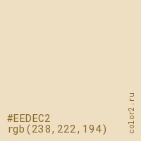 Цвет #EEDEC2 в цветовой модели RGB обозначается тремя октетами (238, 222, 194) в десятичном формате и #EEDEC2 в шестнадцатиричном (hex) формате, которые являются интенсивностью красного 238 (hex EE), интенсивность зелёного 222 (hex DE) и интенсивность синего 194 (hex C2).