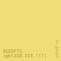 Цвет #EEDF75 в цветовой модели RGB обозначается тремя октетами (238, 223, 117) в десятичном формате и #EEDF75 в шестнадцатиричном (hex) формате, которые являются интенсивностью красного 238 (hex EE), интенсивность зелёного 223 (hex DF) и интенсивность синего 117 (hex 75).