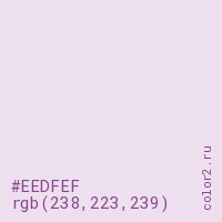 Цвет #EEDFEF в цветовой модели RGB обозначается тремя октетами (238, 223, 239) в десятичном формате и #EEDFEF в шестнадцатиричном (hex) формате, которые являются интенсивностью красного 238 (hex EE), интенсивность зелёного 223 (hex DF) и интенсивность синего 239 (hex EF).