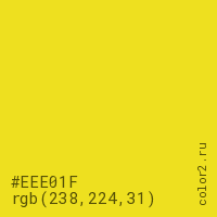 Цвет #EEE01F в цветовой модели RGB обозначается тремя октетами (238, 224, 31) в десятичном формате и #EEE01F в шестнадцатиричном (hex) формате, которые являются интенсивностью красного 238 (hex EE), интенсивность зелёного 224 (hex E0) и интенсивность синего 31 (hex 1F).