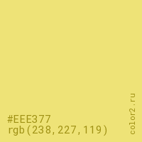 Цвет #EEE377 в цветовой модели RGB обозначается тремя октетами (238, 227, 119) в десятичном формате и #EEE377 в шестнадцатиричном (hex) формате, которые являются интенсивностью красного 238 (hex EE), интенсивность зелёного 227 (hex E3) и интенсивность синего 119 (hex 77).