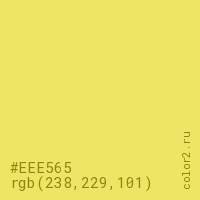 Цвет #EEE565 в цветовой модели RGB обозначается тремя октетами (238, 229, 101) в десятичном формате и #EEE565 в шестнадцатиричном (hex) формате, которые являются интенсивностью красного 238 (hex EE), интенсивность зелёного 229 (hex E5) и интенсивность синего 101 (hex 65).