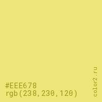 Цвет #EEE678 в цветовой модели RGB обозначается тремя октетами (238, 230, 120) в десятичном формате и #EEE678 в шестнадцатиричном (hex) формате, которые являются интенсивностью красного 238 (hex EE), интенсивность зелёного 230 (hex E6) и интенсивность синего 120 (hex 78).