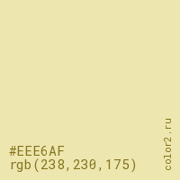 Цвет #EEE6AF в цветовой модели RGB обозначается тремя октетами (238, 230, 175) в десятичном формате и #EEE6AF в шестнадцатиричном (hex) формате, которые являются интенсивностью красного 238 (hex EE), интенсивность зелёного 230 (hex E6) и интенсивность синего 175 (hex AF).