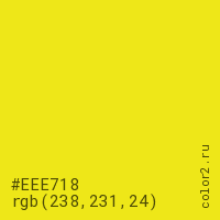 Цвет #EEE718 в цветовой модели RGB обозначается тремя октетами (238, 231, 24) в десятичном формате и #EEE718 в шестнадцатиричном (hex) формате, которые являются интенсивностью красного 238 (hex EE), интенсивность зелёного 231 (hex E7) и интенсивность синего 24 (hex 18).