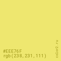 Цвет #EEE76F в цветовой модели RGB обозначается тремя октетами (238, 231, 111) в десятичном формате и #EEE76F в шестнадцатиричном (hex) формате, которые являются интенсивностью красного 238 (hex EE), интенсивность зелёного 231 (hex E7) и интенсивность синего 111 (hex 6F).