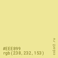 Цвет #EEE899 в цветовой модели RGB обозначается тремя октетами (238, 232, 153) в десятичном формате и #EEE899 в шестнадцатиричном (hex) формате, которые являются интенсивностью красного 238 (hex EE), интенсивность зелёного 232 (hex E8) и интенсивность синего 153 (hex 99).