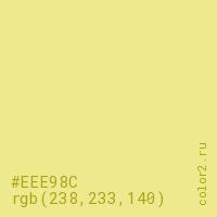 Цвет #EEE98C в цветовой модели RGB обозначается тремя октетами (238, 233, 140) в десятичном формате и #EEE98C в шестнадцатиричном (hex) формате, которые являются интенсивностью красного 238 (hex EE), интенсивность зелёного 233 (hex E9) и интенсивность синего 140 (hex 8C).
