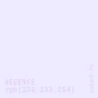 Цвет #EEE9FE в цветовой модели RGB обозначается тремя октетами (238, 233, 254) в десятичном формате и #EEE9FE в шестнадцатиричном (hex) формате, которые являются интенсивностью красного 238 (hex EE), интенсивность зелёного 233 (hex E9) и интенсивность синего 254 (hex FE).
