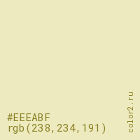 Цвет #EEEABF в цветовой модели RGB обозначается тремя октетами (238, 234, 191) в десятичном формате и #EEEABF в шестнадцатиричном (hex) формате, которые являются интенсивностью красного 238 (hex EE), интенсивность зелёного 234 (hex EA) и интенсивность синего 191 (hex BF).